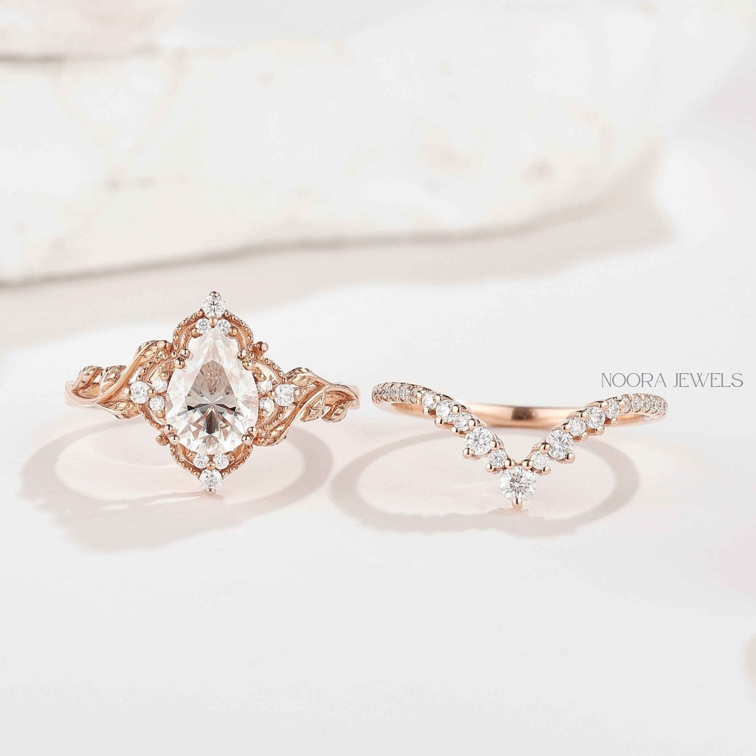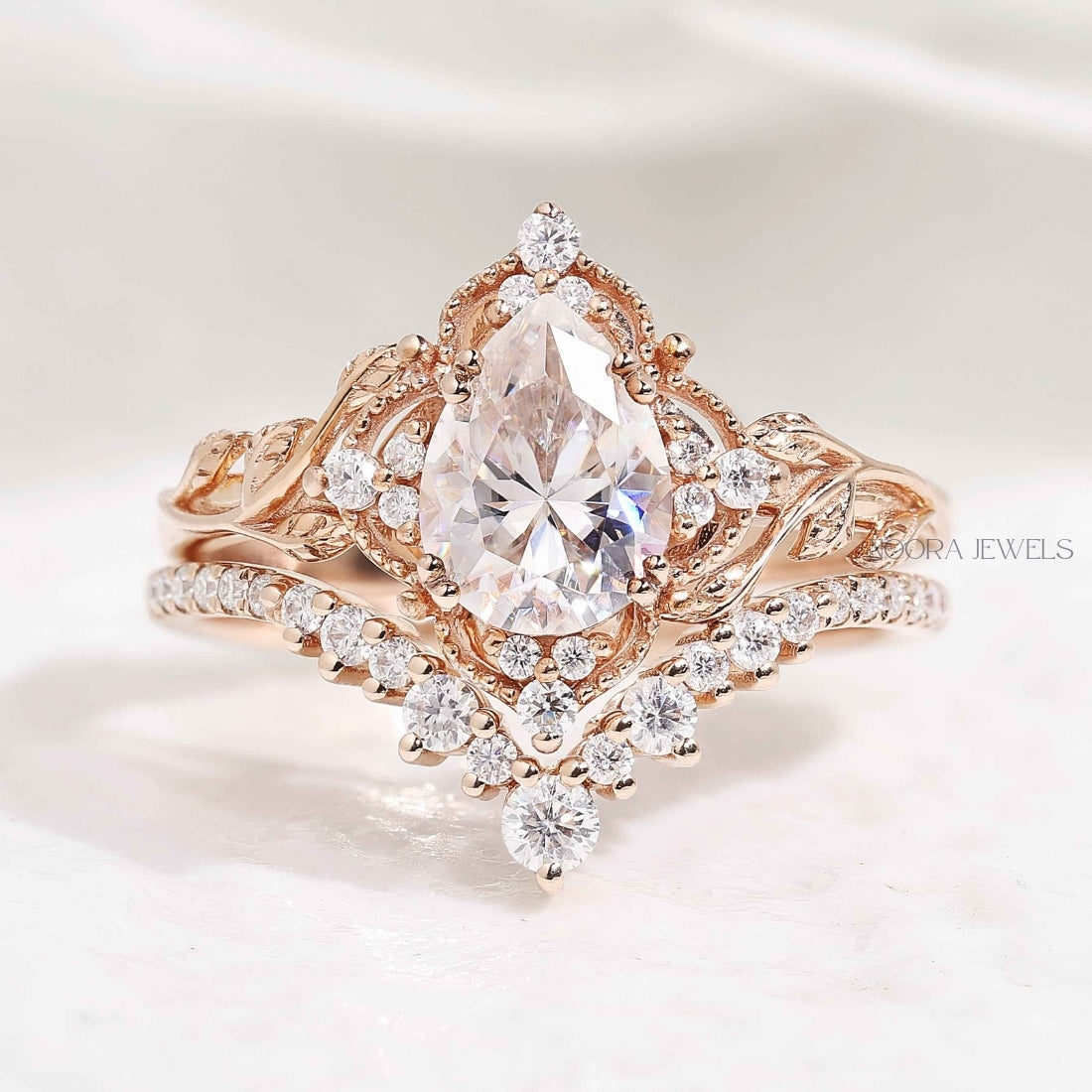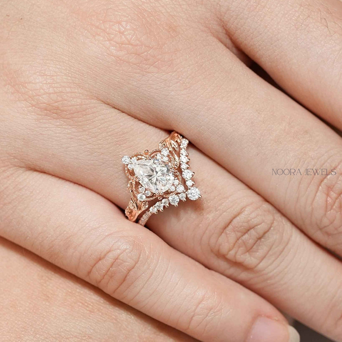 Vintage Pear Cut Moissanite Bridal Ring Set in Rose Gold